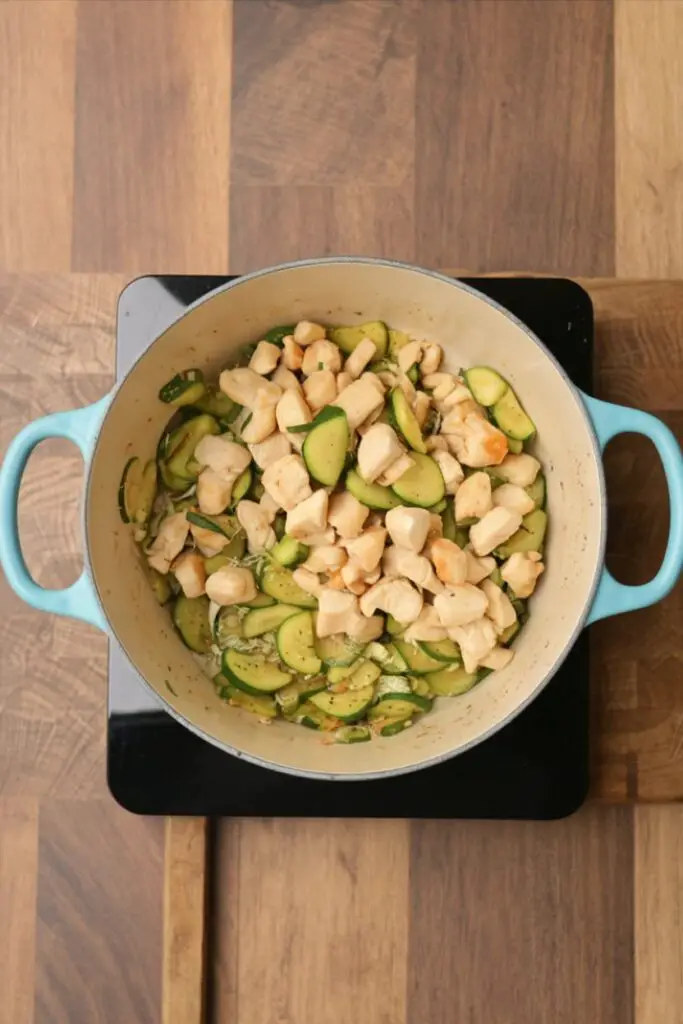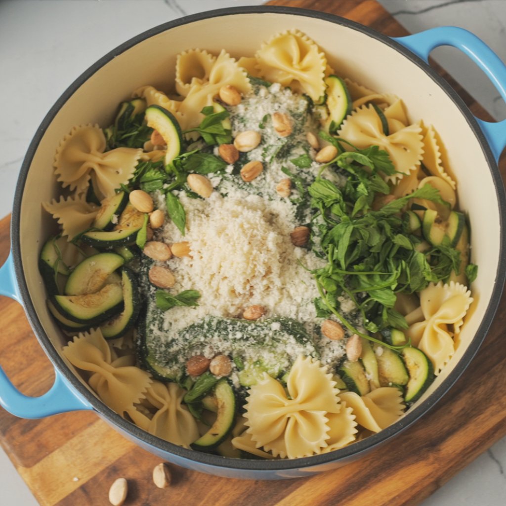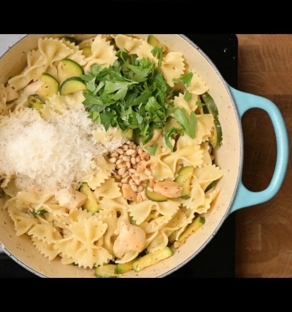 - Prep Ingredients: While pasta cooks, cut the chicken into bite-sized pieces and slice the zucchini. Have garlic, lemon, Parmesan, parsley, and pine nuts ready.