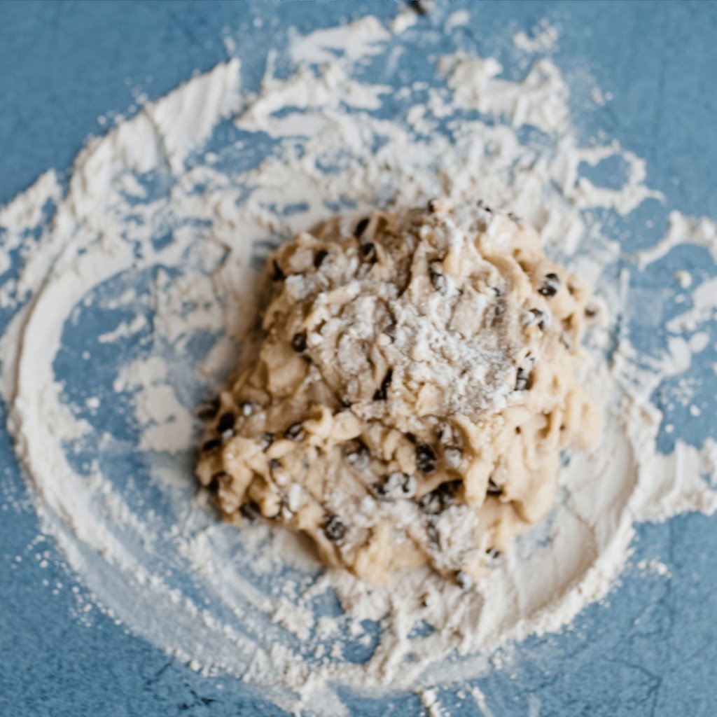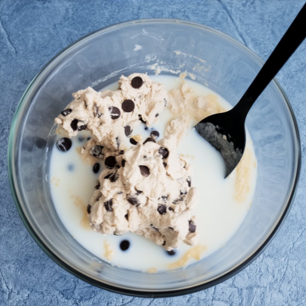 After chilling, remove the bowl from the fridge. Stir the sugar and chocolate chips into the flour mixture until they are evenly distributed. Pour in 1 cup of milk and stir gently with a spatula just until the dough is moistened and starts to come together. If it seems too dry, add more milk, one tablespoon at a time. Be careful not to overmix!