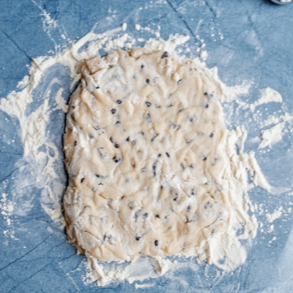 Turn the shaggy dough onto a lightly floured surface. Pat to ~1-inch thick. Letter-fold: fold right third over center, then left third over top. Pat out again and repeat once more. -
