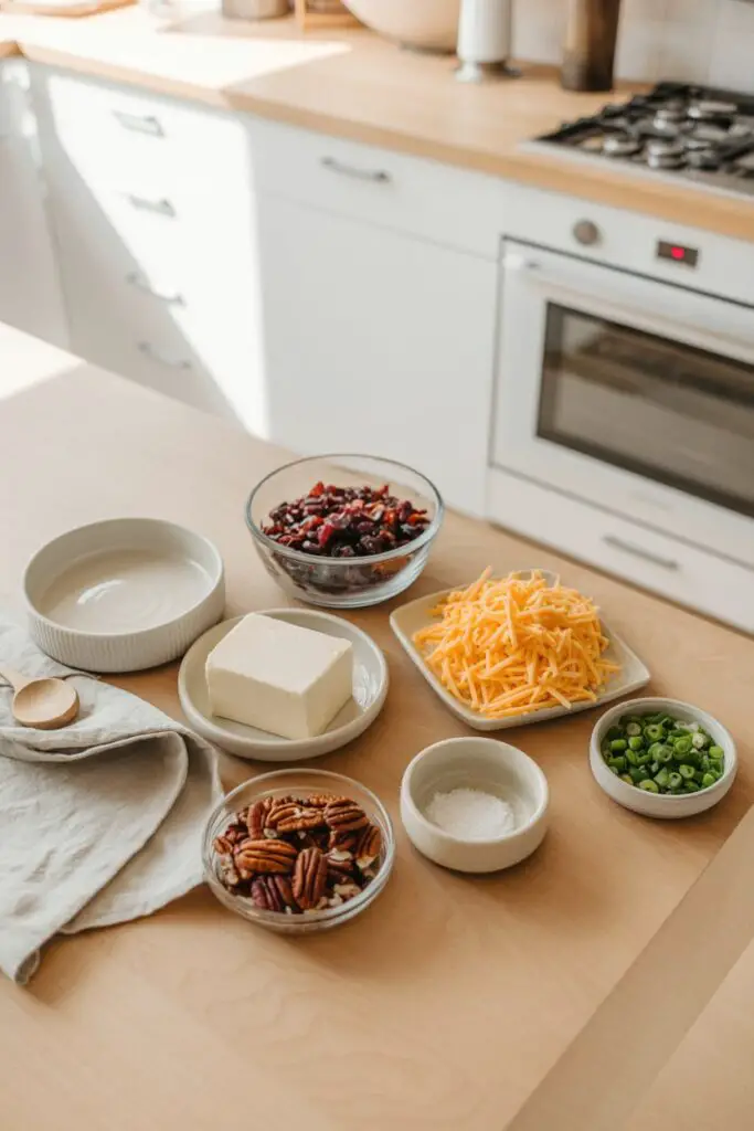 - Combine the Cheese Filling: In a large mixing bowl, add the softened cream cheese, shredded sharp cheddar cheese, finely chopped dried cranberries, chopped green onions, honey, garlic powder, and onion powder.