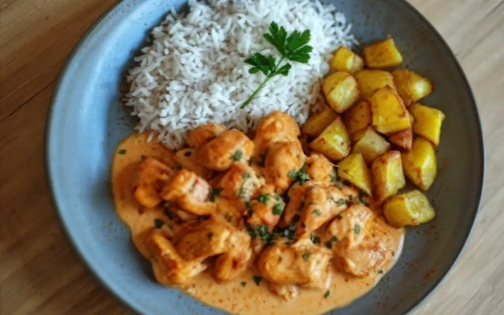 - Assemble & serve: Spoon rice onto plates, top with creamy garlic chicken and sauce, and add a generous side of roasted potatoes. Garnish with extra parsley if desired.