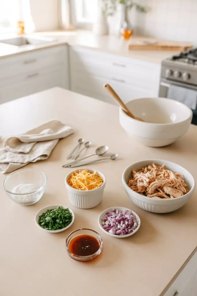 - Combine the Filling: In a large mixing bowl, add the shredded cooked chicken, shredded cheddar cheese, chopped red onion, and optional fresh cilantro. Pour in the ½ cup of barbecue sauce. Toss everything together until all the ingredients are evenly coated.