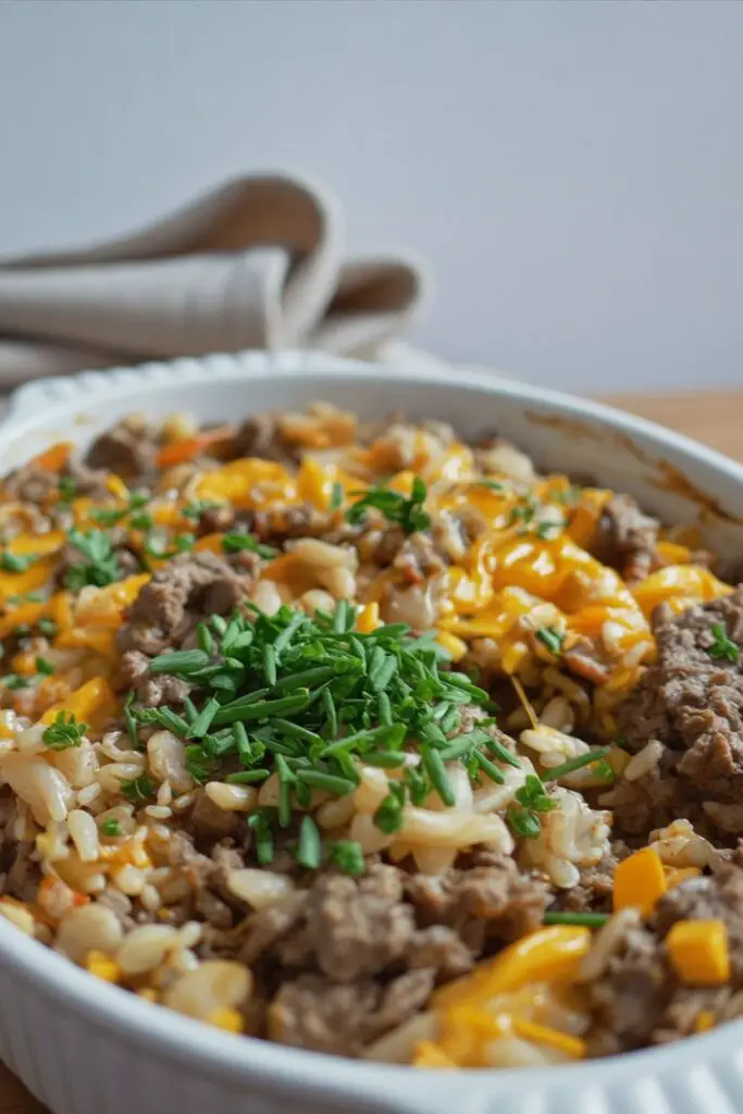 It’s generally not recommended to assemble this casserole too far in advance with uncooked rice, as the rice might start absorbing the liquid unevenly before baking. However, you can brown the ground beef ahead of time and store it in the fridge. Then, simply assemble the casserole right before baking.