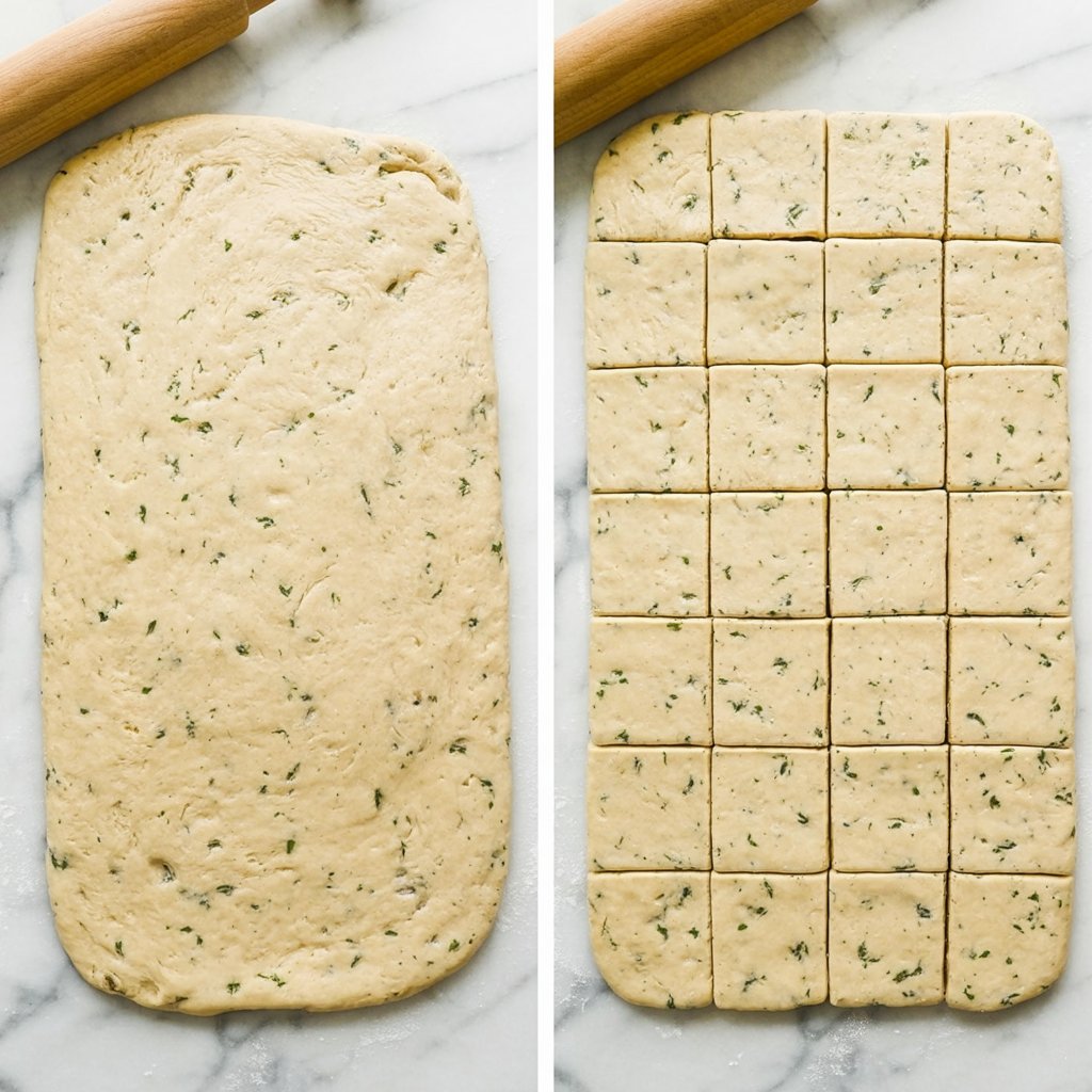 Using a pizza cutter or a sharp knife (a ruler can help for straight lines), cut the dough into your desired cracker shape. Small rectangles, about 3 x 1.5 inches, work well. Carefully transfer the cut crackers to your prepared baking sheets, leaving a little space between each one.