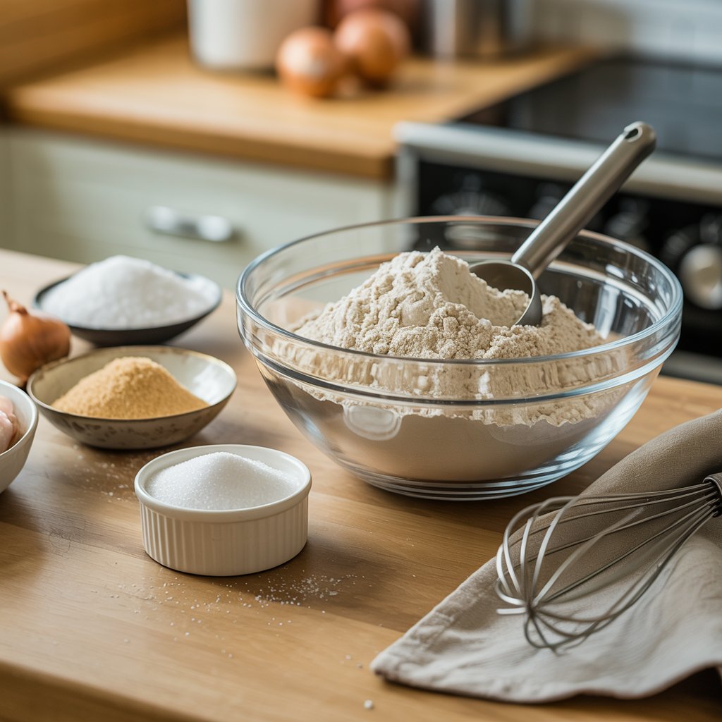- In a large bowl, whisk flour, sugar, salt, onion powder, garlic powder, and rosemary (or chosen add-in).