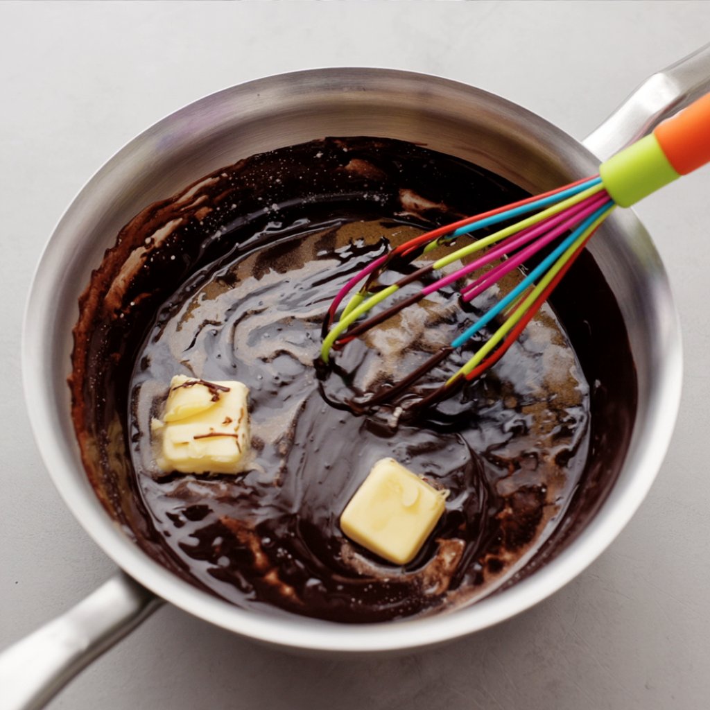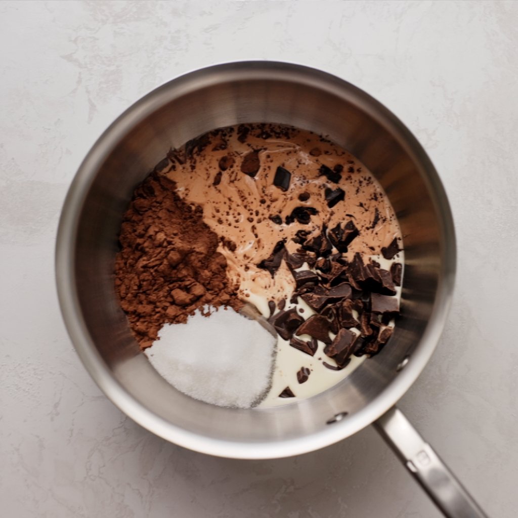 - Combine & Melt: In a medium saucepan, whisk together the chopped chocolate, sugar, cream, corn syrup, cocoa powder, and salt over medium heat until smooth and melted.