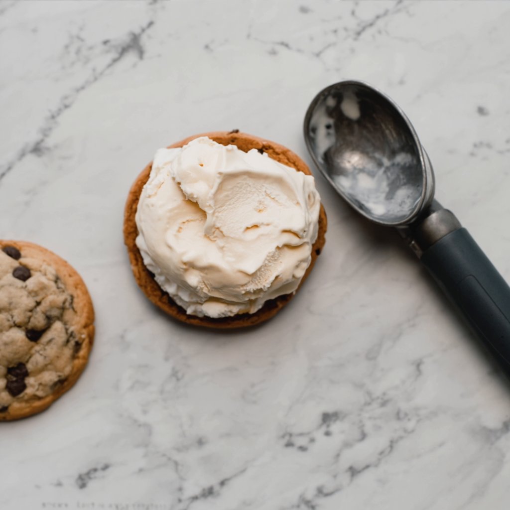 - Place one cookie upside down, top with ~⅓ cup ice cream, then another cookie right-side up.
