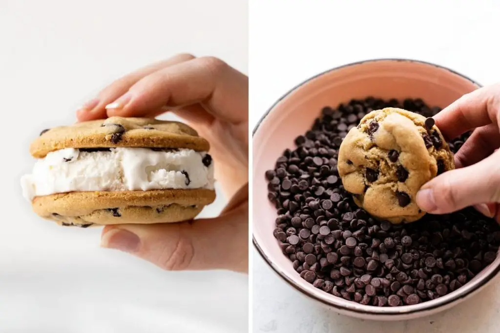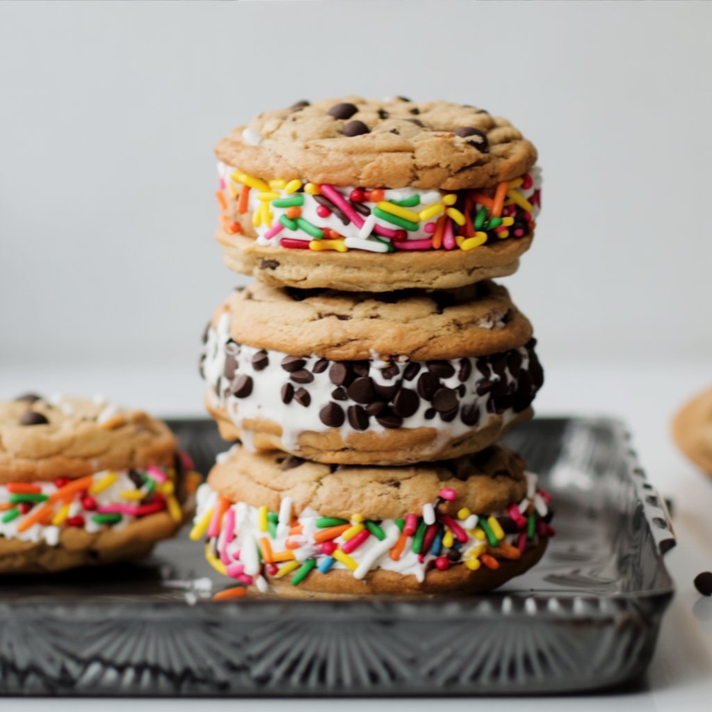Soft, chewy chocolate-chip cookie “sandwiches” filled with generous scoops of ice cream and rolled in your favorite toppings. These make-ahead treats stay tender even straight from the freezer—no more rock-hard cookies!