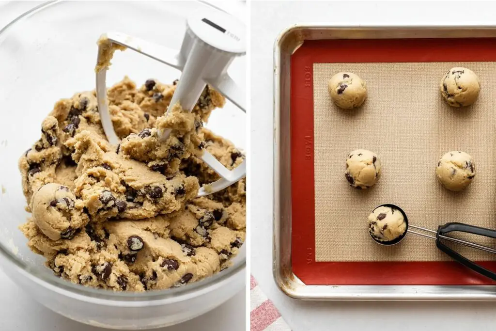 Add the egg, extra egg yolk, and vanilla extract to the creamed butter mixture and beat on high until just combined. Reduce the speed to low and gradually add the dry ingredients, mixing until they are just incorporated. Be careful not to overmix! Finally, stir in the mini chocolate chips. The dough will be soft and sticky.