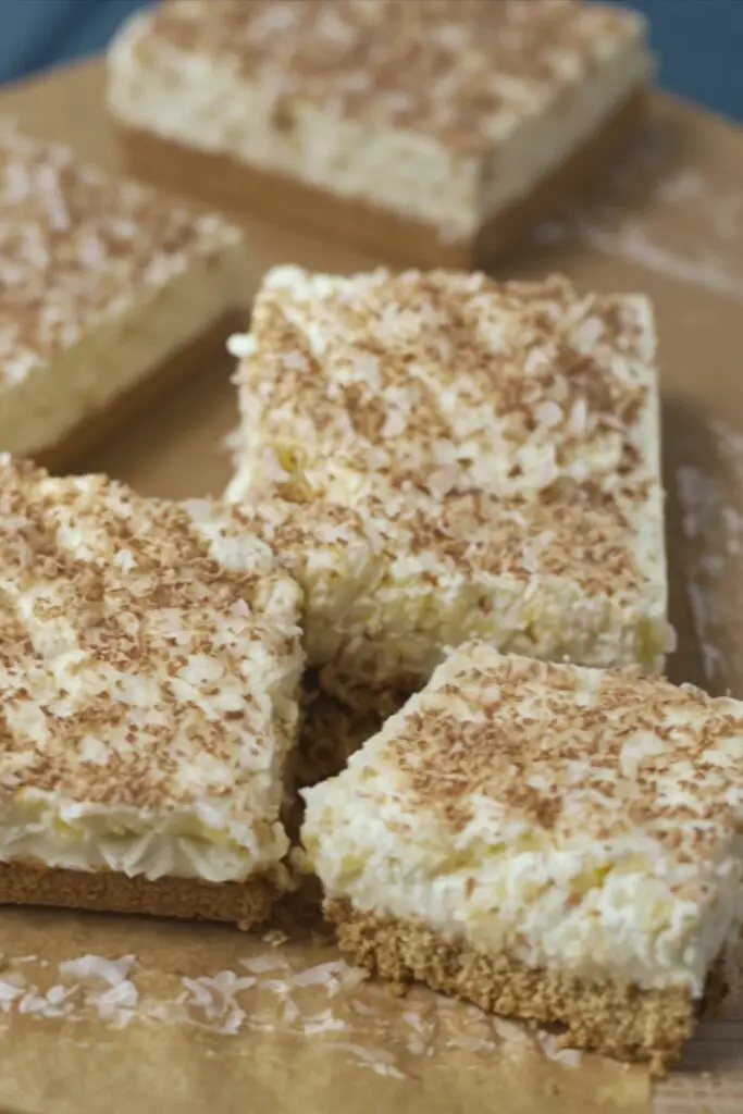 - Assemble and Chill: Gently spread the pineapple cream mixture over the cream cheese layer. Cover the pan and refrigerate for at least 4 hours, or preferably overnight, to allow the dessert to set completely. Once chilled, lift out of the pan, cut into 16 squares, and serve.
