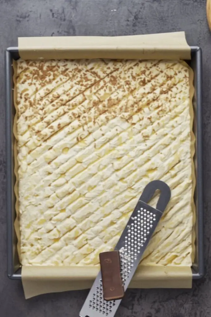 - Easy Removal: Use the overhanging parchment paper as “handles” to easily lift the entire traybake out of the pan before cutting.