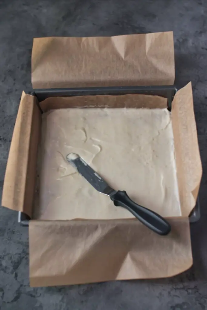 First, line a square cake pan (an 8×8 or 9×9 inch pan works perfectly) with parchment paper, leaving some overhang on the sides to make it easy to lift the traybake out later. Next, and this is the most crucial step, pour the can of crushed pineapple into a fine-mesh sieve set over a bowl. Let it drain thoroughly, pressing down gently with a spoon every so often to remove as much liquid as possible. Set it aside to continue draining while you prepare the other layers.