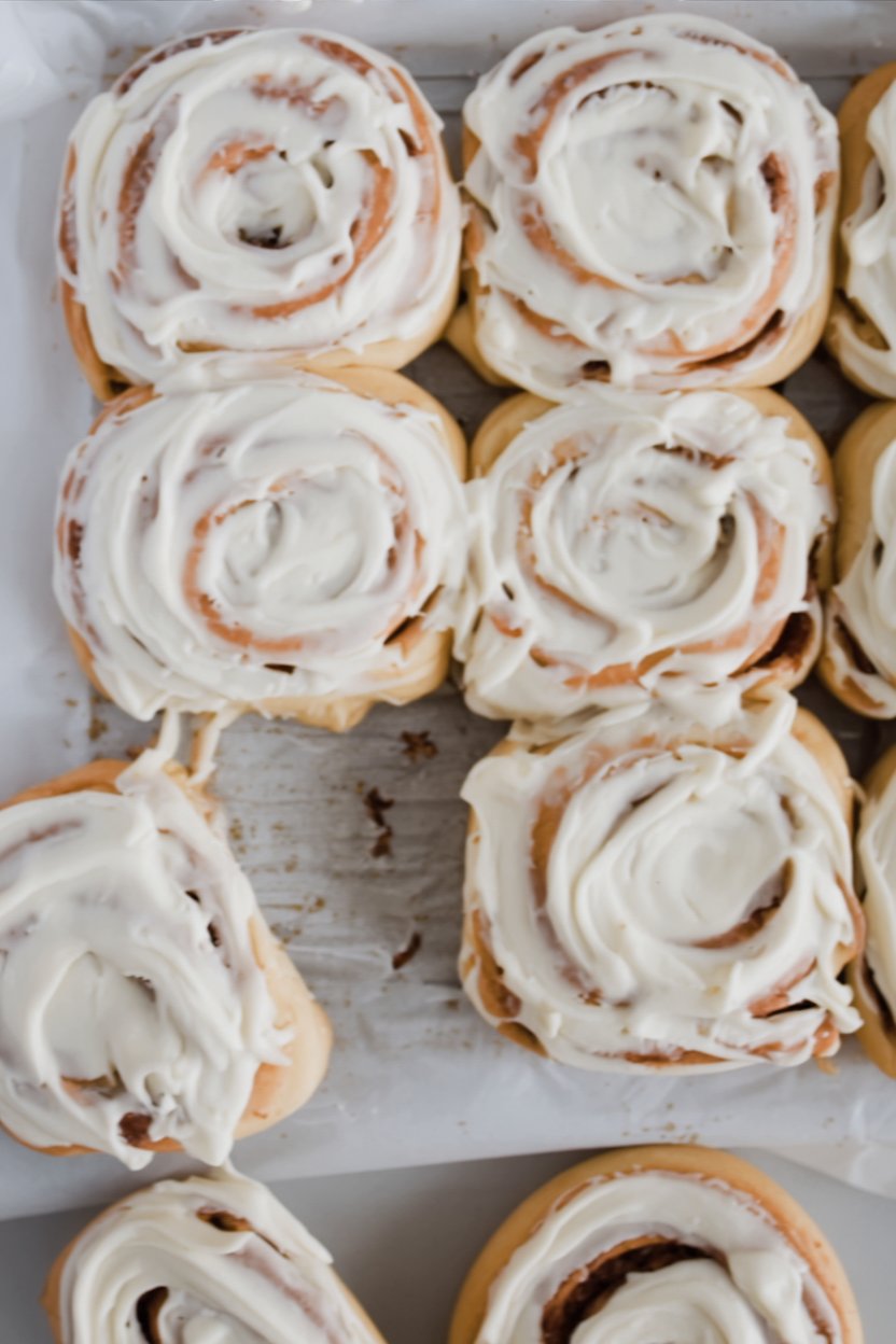 While the rolls bake, beat together the butter, cream cheese, powdered sugar, and vanilla extract until fluffy. Add milk/cream to reach your desired consistency. Let the rolls cool for 10 minutes, then spread a generous dollop of frosting on each warm roll. Watch it melt into the crevices and enjoy!