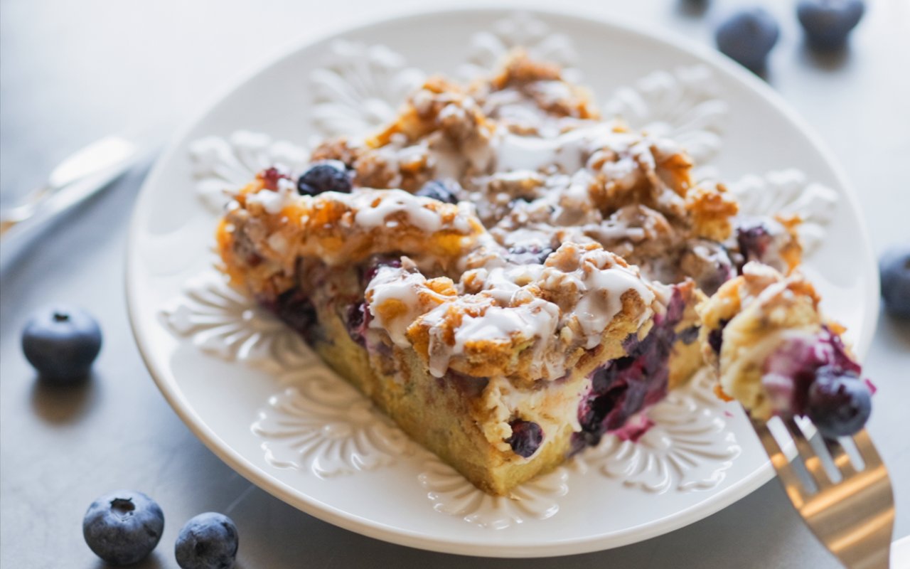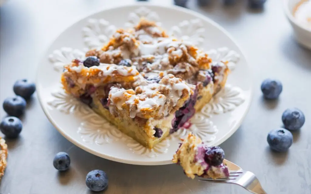 Top the blueberries with the remaining waffle pieces. In a separate microwave-safe bowl, melt the 41 cup of butter. Let it cool for a minute so you don’t scramble the eggs. Whisk in the eggs, milk, granulated sugar, vanilla, and cinnamon until everything is well combined. Pour this custard mixture evenly over the entire casserole.