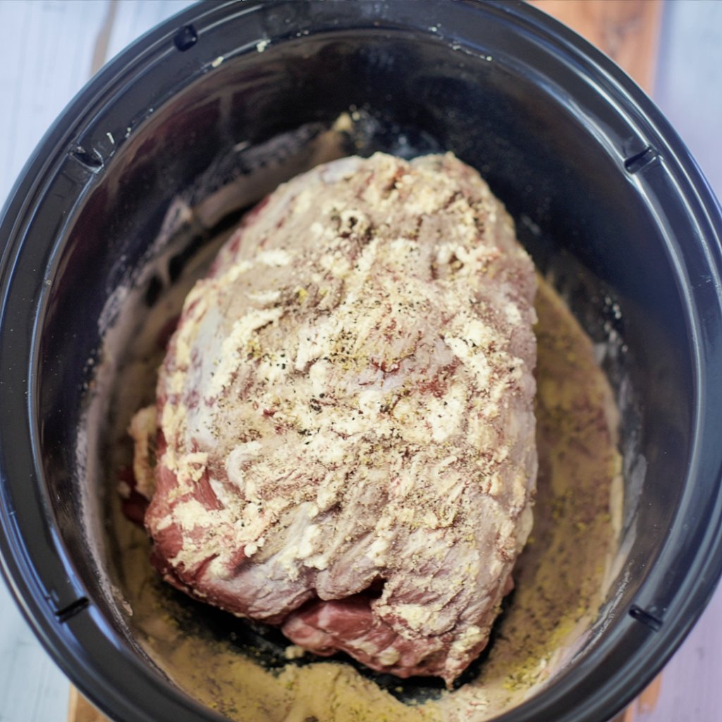 - Place the Roast: Add the 3–4 lb boneless pork shoulder to the slow cooker. No searing required.