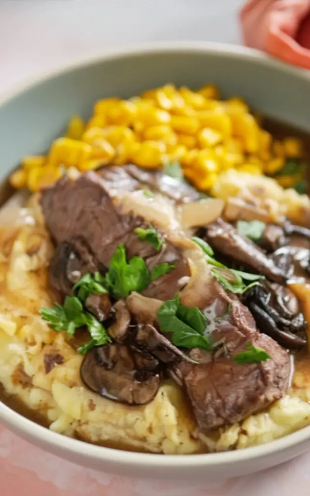 - Slice or shred & serve: Remove steak (very tender). Slice against the grain or shred with two forks. Serve with the creamy mushroom-onion gravy.