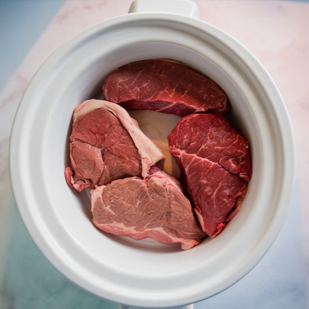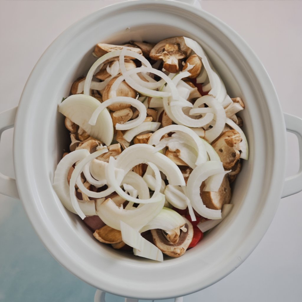 - Layer ingredients: Place round steak in the bottom of the slow cooker. Top with sliced mushrooms and sliced sweet onion. No searing needed.
