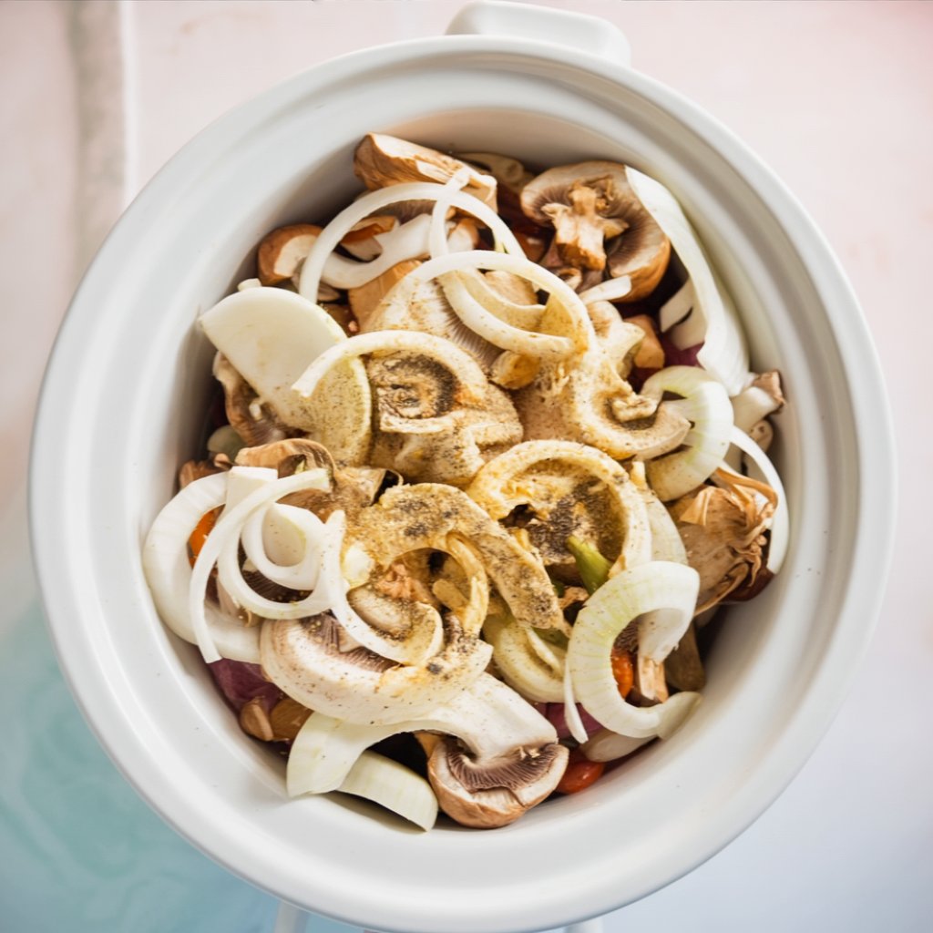 - Add seasonings & liquids: Whisk garlic powder, onion powder, Italian seasoning, salt, and pepper. Sprinkle over onions and mushrooms. Pour in beef bone broth and Worcestershire sauce.