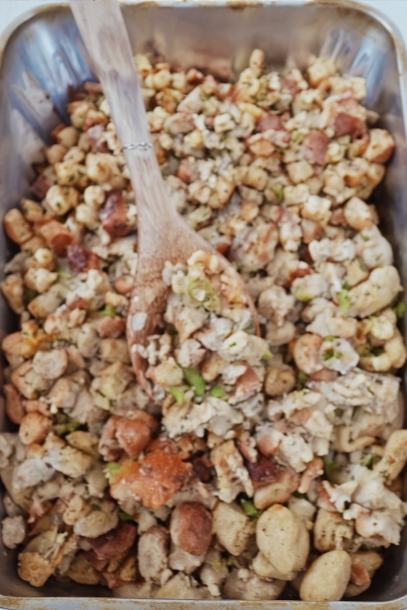 Good stuffing requires a bit of patience to let the liquid absorb into the bread, ensuring a moist interior.
