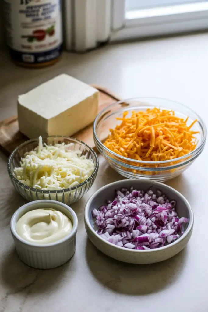 - Prepare the dish: Add cream cheese, grated cheese, mayonnaise, and diced purple onion directly to a shallow 9-inch baking dish. No mixing bowl needed.