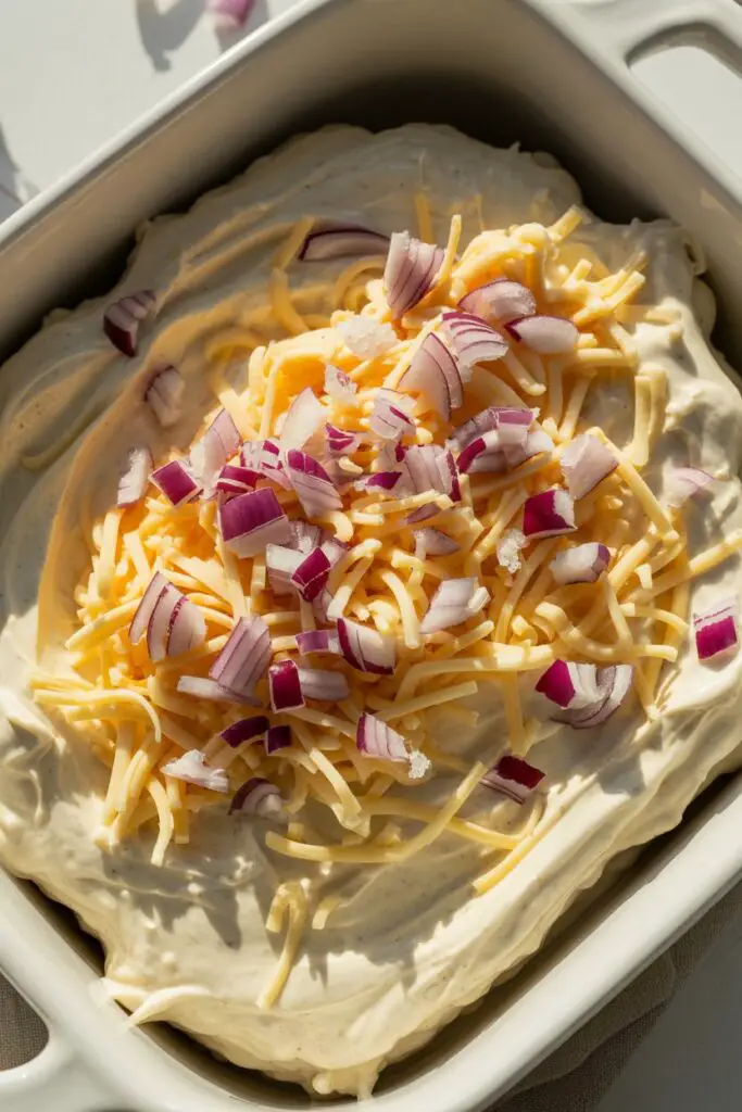 Grab a shallow baking dish—a 9-inch square pan or a round quiche pan works perfectly. Place the block of cream cheese, the 2 cups of grated cheese, the 1 cup of mayonnaise, and the diced purple onion directly into the dish. There is no need to dirty a separate mixing bowl!