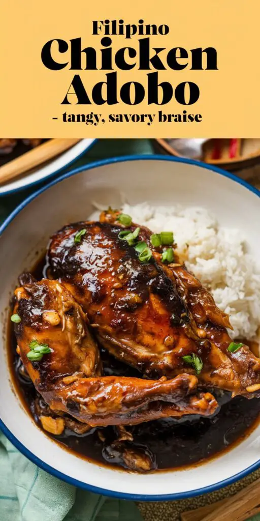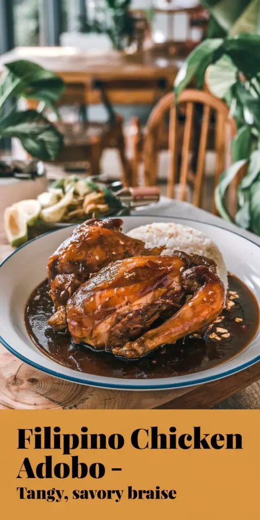 I first encountered Filipino Chicken Adobo via a friend’s potluck dish, where the succulent chicken and aromatic sauce immediately captivated me—particularly the interplay of tang from vinegar and umami from soy. Replicating it at home, I discovered each household holds a personal spin: some add coconut milk, others incorporate sugar or sweet onions, and the ratio of vinegar to soy might shift across regions. At its heart, though, the primary flavors revolve around that marinade-braise approach: letting chicken soak or simmer in vinegar, soy, garlic, and spices, culminating in a spoon-licking sauce that calls for extra rice. Now, Filipino Chicken Adobo remains a steadfast weeknight option—both because it’s simple to prepare and each mouthful exudes comfort and warmth tied to Filipino traditions.