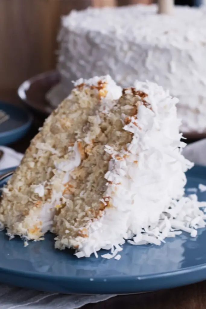 Add the second layer on top. Frost the top and sides of the entire cake with the remaining frosting. It should be thick and billowy. Finally, press the remaining sweetened coconut flakes onto the top and sides of the cake for that classic snowy look.