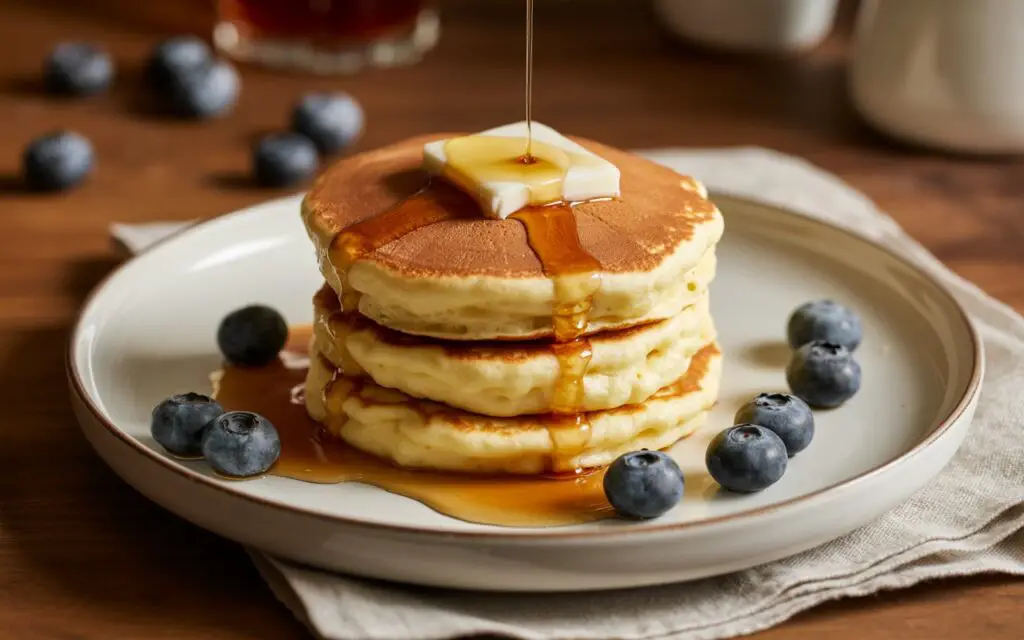 Stack pancakes, drizzle with maple syrup or honey, and garnish with fresh berries or mint.