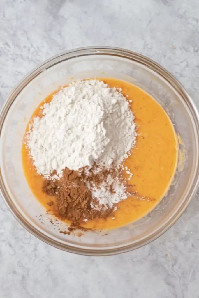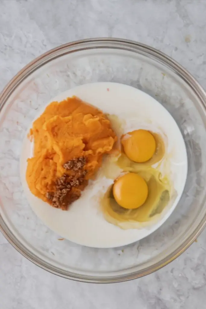 - Mix the wet ingredients: In a large bowl, whisk mashed sweet potatoes, eggs, milk, brown sugar, and maple syrup until mostly smooth (a few small potato bits are fine).
