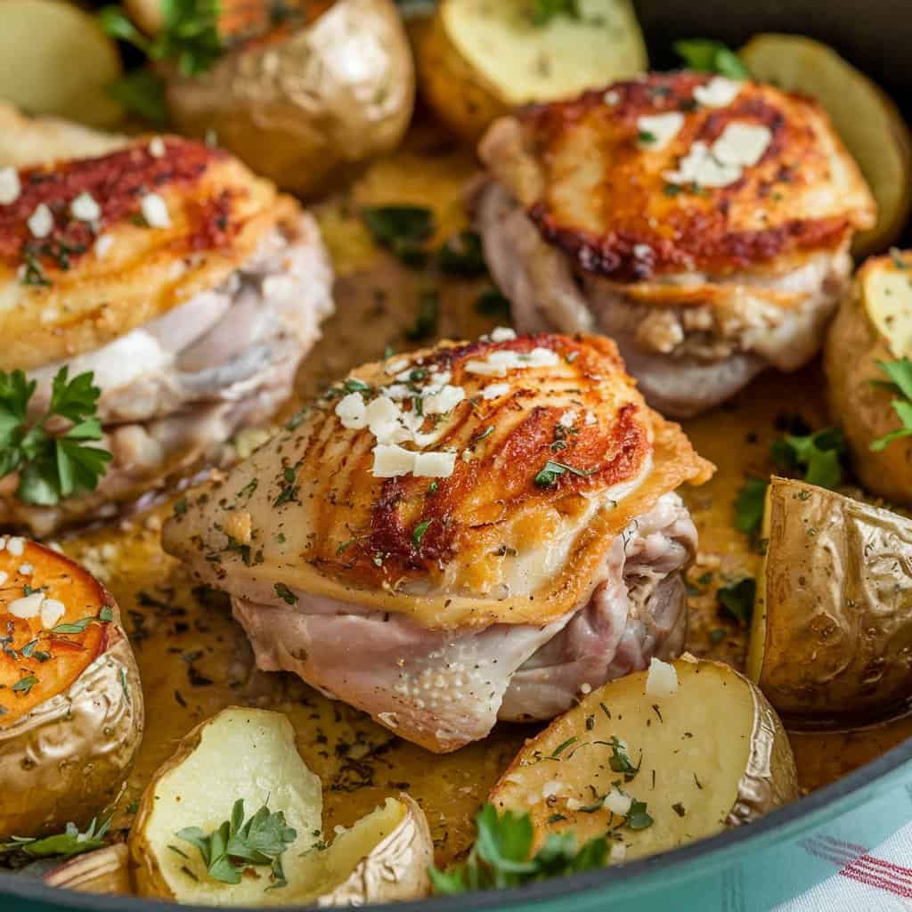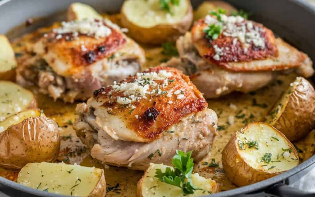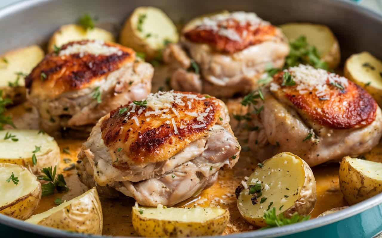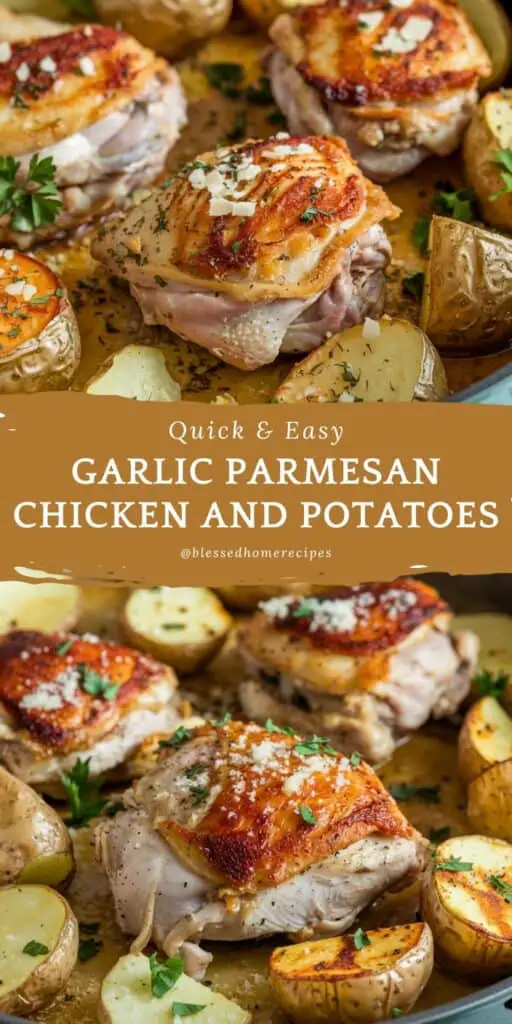 Enjoy your Garlic Parmesan Chicken and Potatoes—a simple, one-pan dinner that’s as delicious as it is easy to prepare!