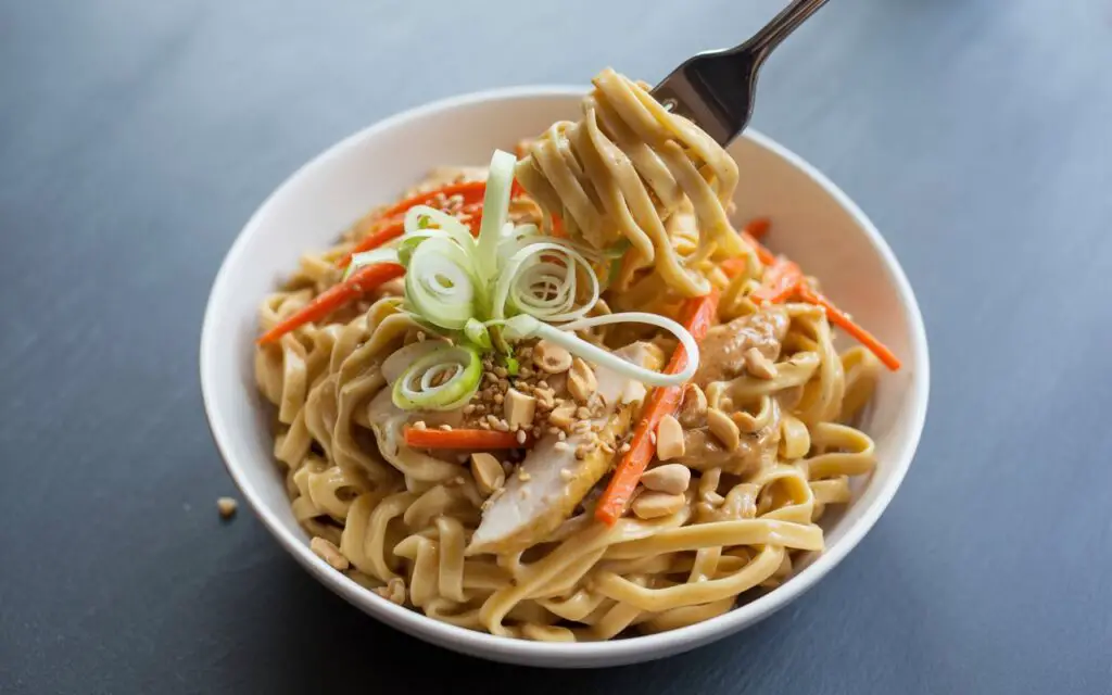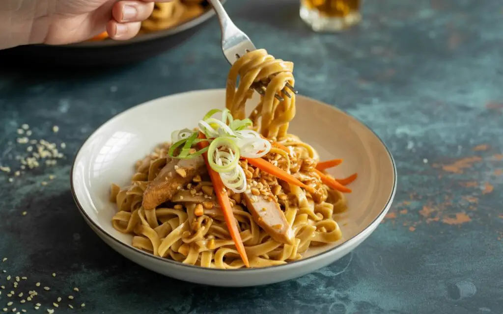 Tip: Reserve ½ cup of the starchy pasta water before draining—that liquid will help thin and emulsify your chicken peanut sauce.