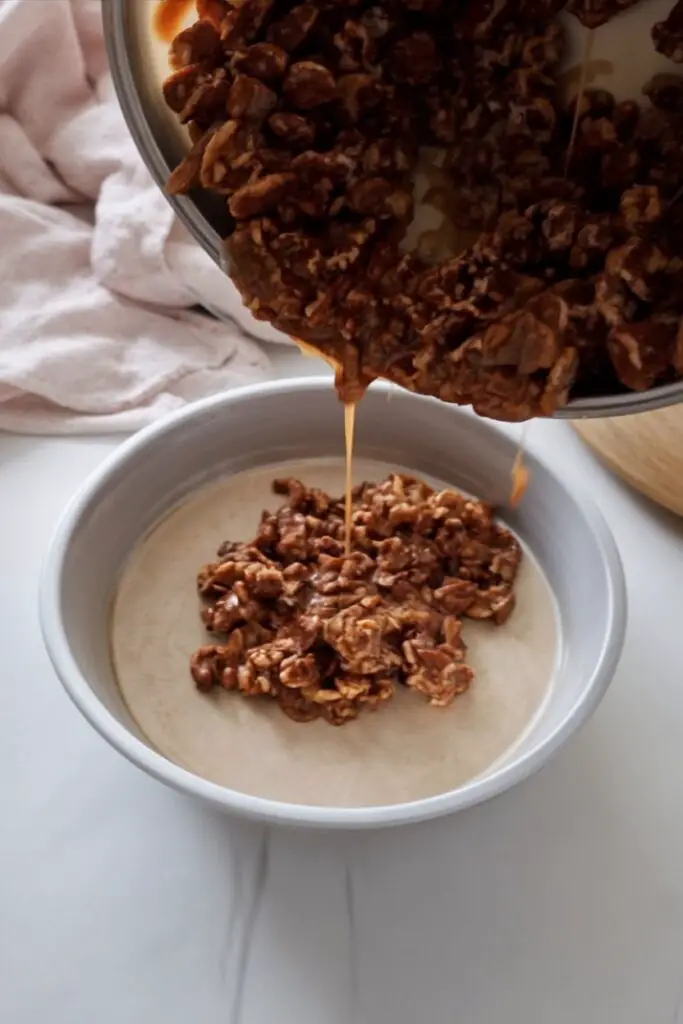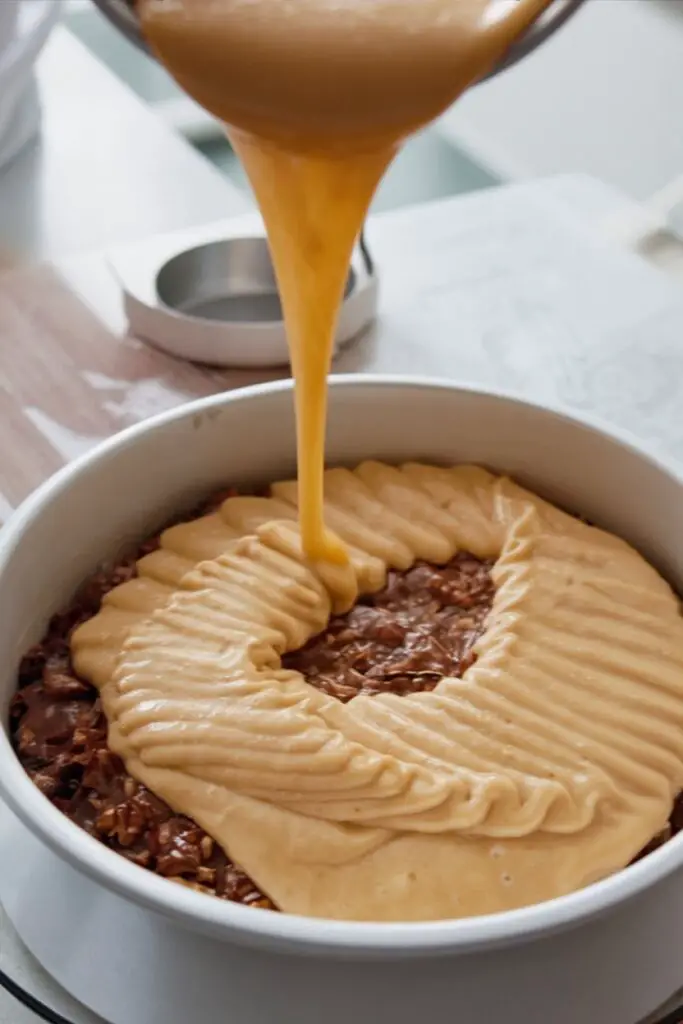 - Gently pour this batter on top of the caramel pecan layer in your cake pan. Smooth the top into an even layer.
