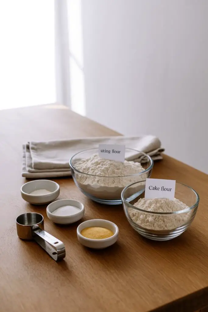 - Whisk dry ingredients: In a large bowl, whisk all-purpose flour, cake flour, corn starch, baking soda, baking powder, and salt until evenly combined.