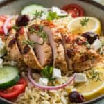 Experience the vibrant flavors of the Mediterranean with this Greek Chicken and Orzo dish. Tender, marinated chicken pairs beautifully with perfectly cooked orzo, fresh cherry tomatoes, spinach, and a zesty lemon-garlic sauce. Enhanced with a sprinkle of feta and fresh herbs, this dish brings a taste of Greece straight to your table.