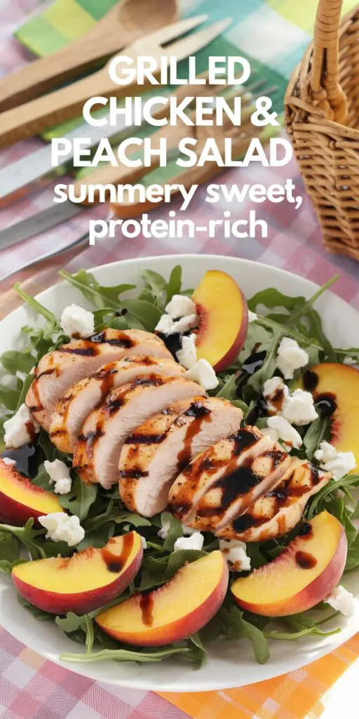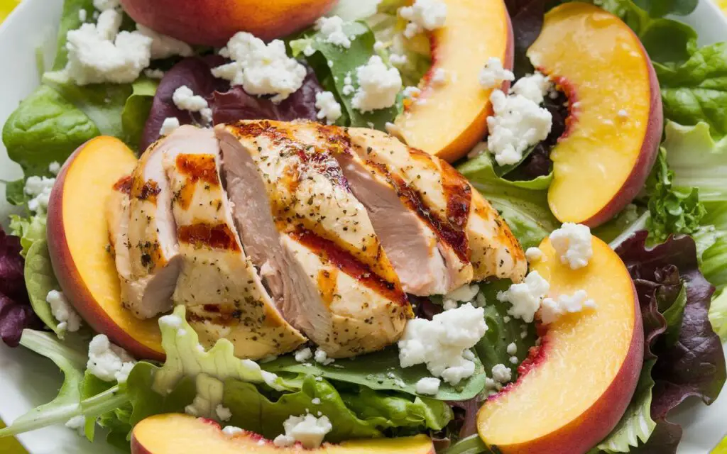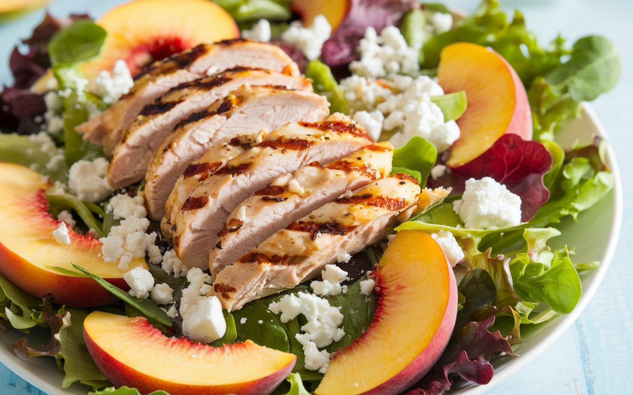 Grilled Chicken & Peach Salad – Summery Sweet, Protein-Rich Bliss Now spotlights the magic that happens when juicy, subtly caramelized peaches nestle against tender, savory chicken on a bed of crisp greens. The hot grill intensifies both the poultry’s smokiness and the fruit’s natural sweetness. And because it’s all set atop fresh salad greens—drizzled with a tangy, lightly sweet dressing—you’ll revel in each bite’s contrast of warm and cool, sweet and salty, tender and crunchy.