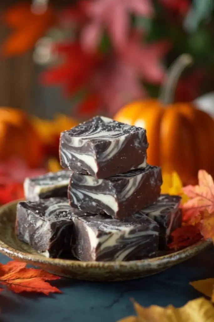 A no-bake, jet-black chocolate fudge swirled with white chocolate and finished with silver starlight glitter—perfect for Halloween parties and midnight treats.