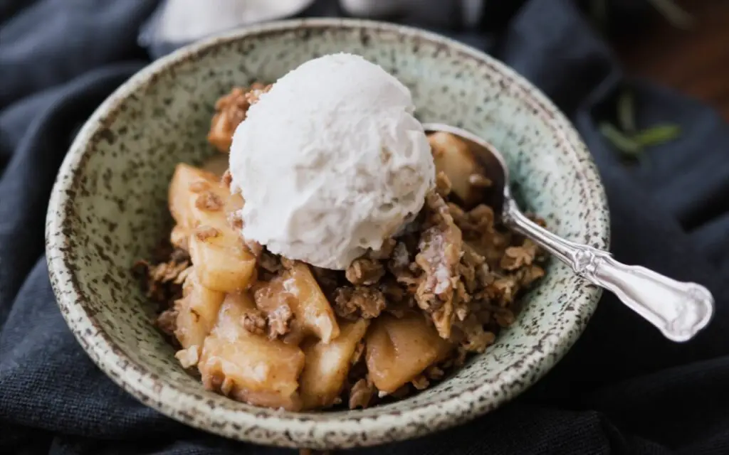 A warm bowl of this healthy apple crisp is a true delight, especially with a simple, creamy topping.