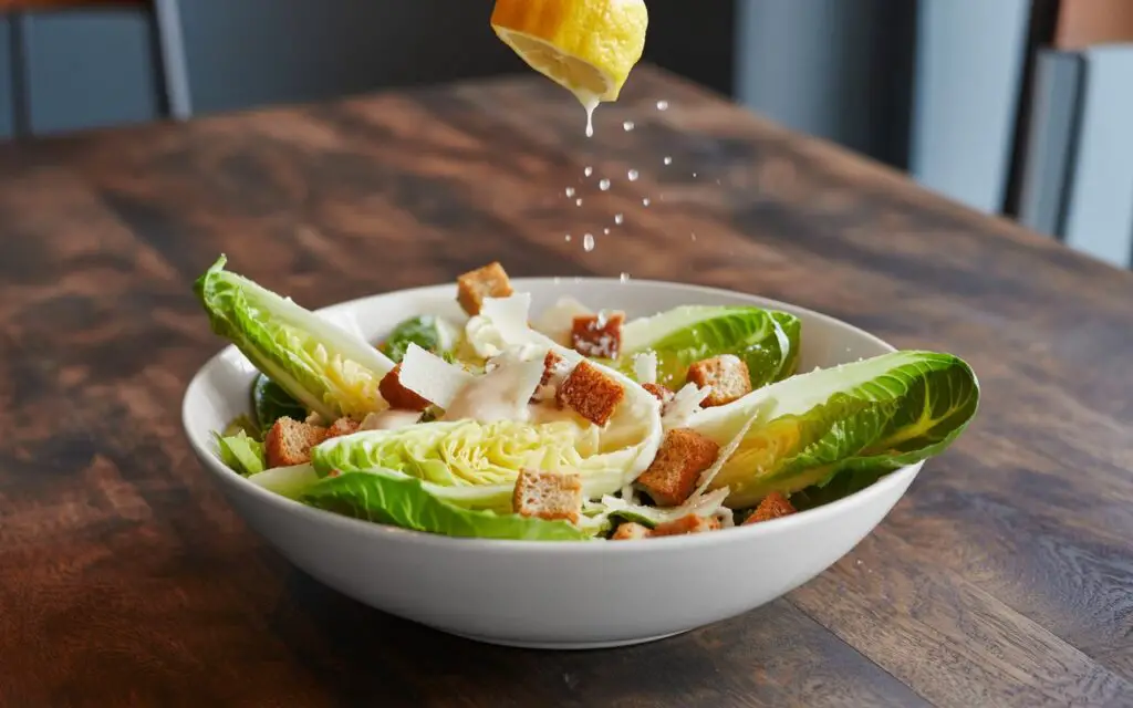 Divide the salad onto plates or a large serving platter. Top with the remaining croutons and a final grating of Parmesan. For a personalized touch, add a few lemon zest shavings or a drizzle of high-quality extra virgin olive oil. Serving note: If adding protein, place grilled chicken, shrimp, or tofu strips on top for a complete meal.