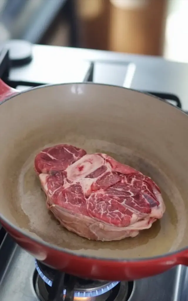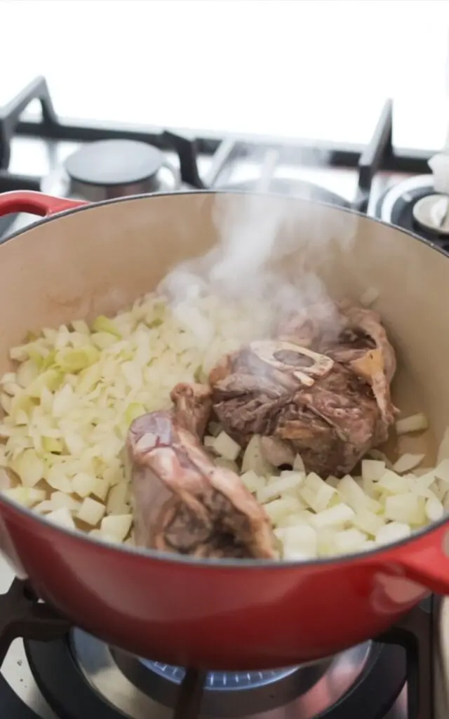 Heat 2 teaspoons of oil in a large, heavy-bottomed pot or Dutch oven over medium-high heat. Add the beef shank or stew meat and let it brown well on one side without moving it, for about 3-4 minutes. Flip the beef over and add the chopped onions to the pot. Continue to cook, stirring the onions occasionally, until they have softened, about 5 minutes.