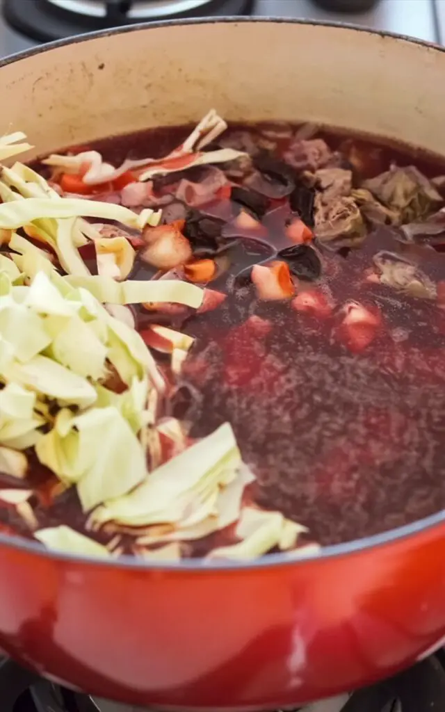 - Assemble the Soup: Return the pot of broth to medium heat. Add the remaining 4 cups of broth, the roasted vegetables, chopped beef, sliced cabbage, and ½ cup of fresh dill. Simmer for 15 minutes, until the cabbage is tender.