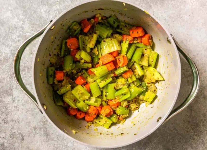 - Sauté the Mirepoix: Add celery, carrots, and onion. Season with 2 tsp kosher salt. Reduce heat to medium and cook about 10 minutes, stirring occasionally, until the vegetables soften and release liquid.