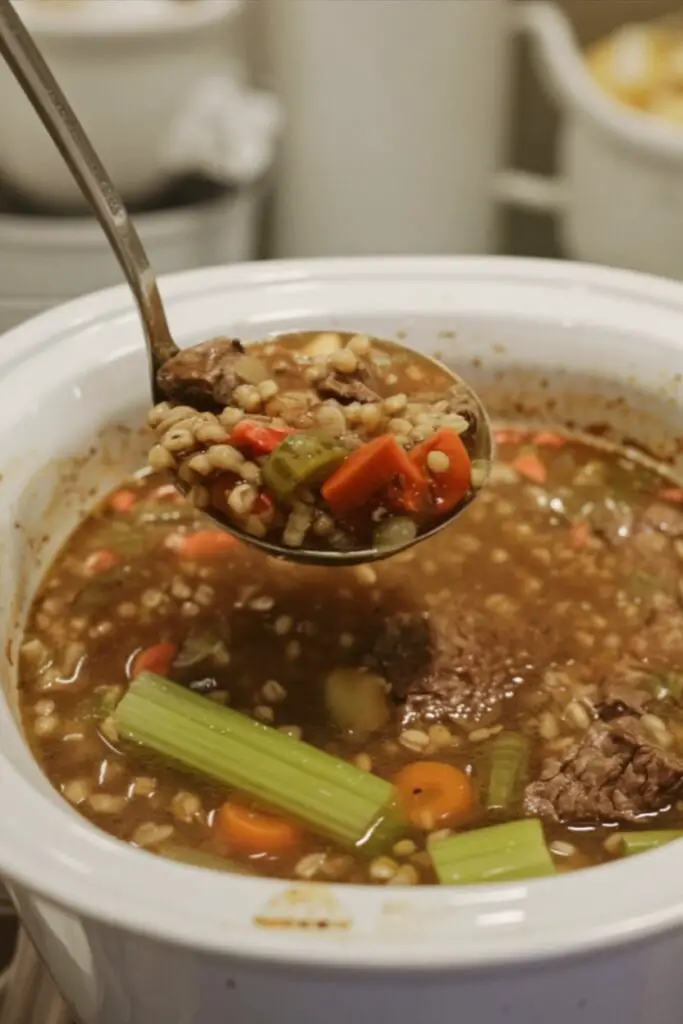 Cover the crock pot with the lid. Cook on Low for 7–8 hours or on High for 3–4 hours. You are looking for the beef to be fork-tender and the barley to be soft and chewy. Taste the broth before serving and add more salt or pepper if needed.