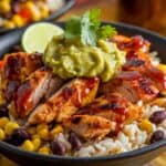 - Top each bowl with the honey chipotle chicken, then add red bell pepper strips, corn, black beans (if using), and diced avocado.
