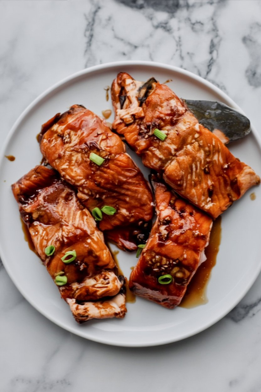 Transfer the baked salmon to a serving platter. Drizzle the warm, thickened glaze generously over each fillet. Top with chopped green onions and a sprinkle of toasted sesame seeds for a professional touch. Serve immediately while hot and glossy.