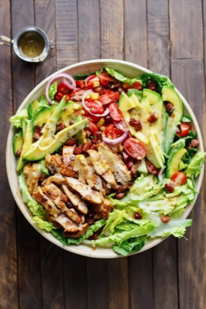 Do not reuse marinade that touched raw chicken—discard after use. Swap turkey bacon for lighter macros, or add cucumbers and shredded carrots for extra crunch. For meal prep, store components separately and dress just before serving.