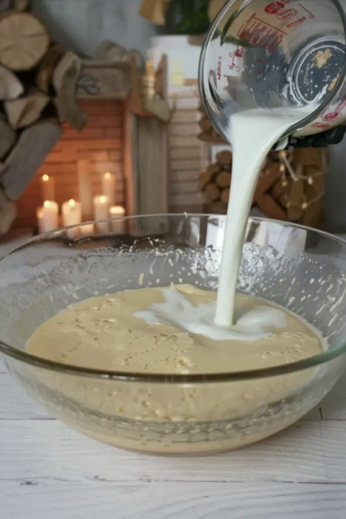 Add Wet Ingredients: Pour in warm milk, melted butter, and vanilla. Mix gently to combine.