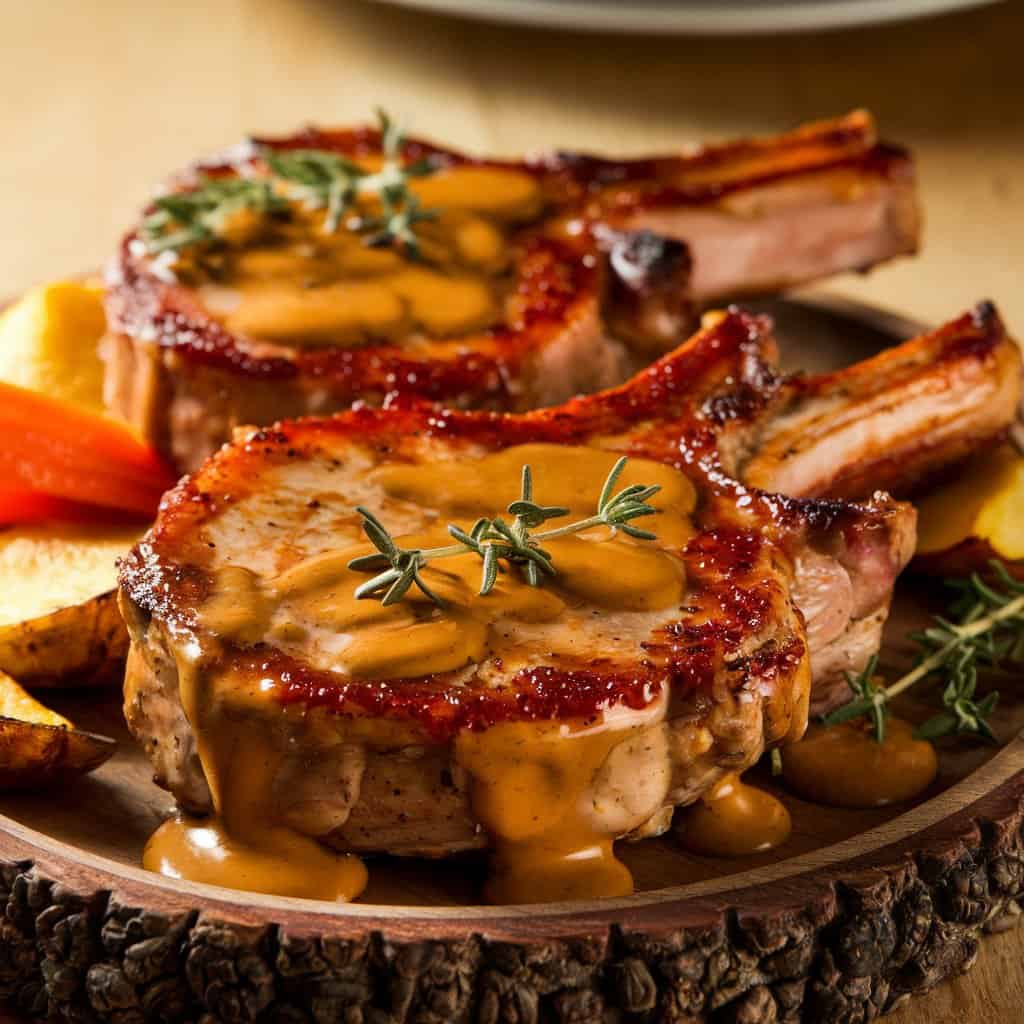 Before serving, sprinkle freshly chopped thyme or rosemary over the pork chops. This not only adds a burst of color but also enhances the dish’s aromatic appeal. - Plating and Serving:
