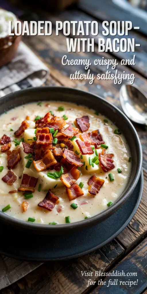 Imagine curling up with a warm bowl of comfort—a creamy, velvety potato soup generously loaded with crispy bacon bits and sprinkled with fresh, vibrant chives. Loaded Potato Soup with Bacon is the ultimate comfort food that brings together hearty, smooth potatoes with the irresistible crunch and savory saltiness of bacon. Every spoonful delivers a perfect balance of creamy goodness and bold, smoky flavor, making it an ideal dish for cozy evenings or family gatherings. I still remember the first time I enjoyed this soup—the combination of the silky, well-seasoned broth with the delightful contrast of crispy bacon was nothing short of magical, a true testament to the art of satisfying, home‑cooked comfort.