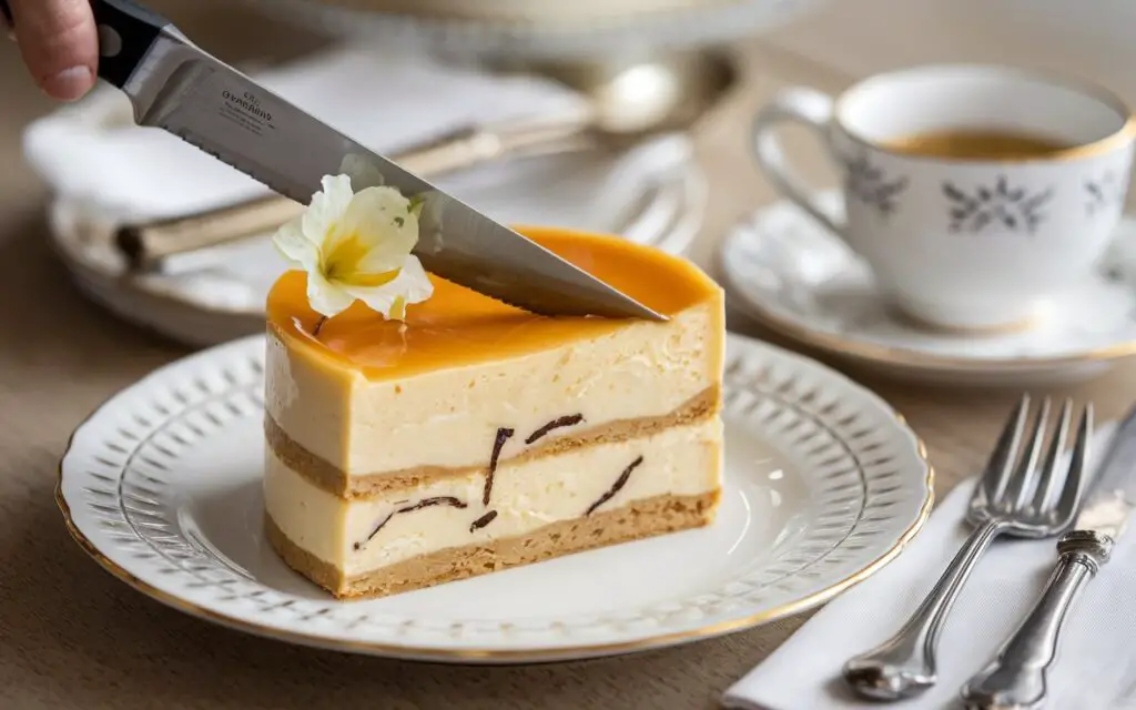Using the parchment overhang, lift the cake and transfer it to the fridge. Chill uncovered for at least 30 minutes. For clean slices, dip a sharp knife in hot water, wipe dry, and slice. Each piece reveals three perfect strata: crust, custard, sponge.