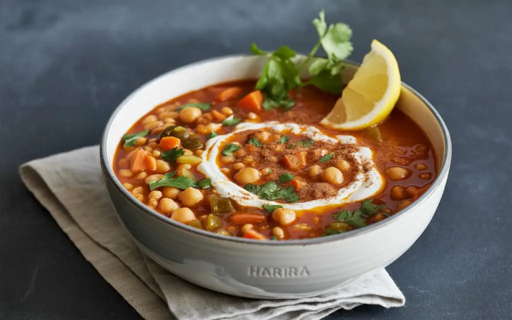 Harira is a heartier tomato-lentil-chickpea stew, while chermoula soup typically features a lighter broth infused with parsley-cilantro marinade, fish or vegetables, and lemon. Both share North African spice profiles.